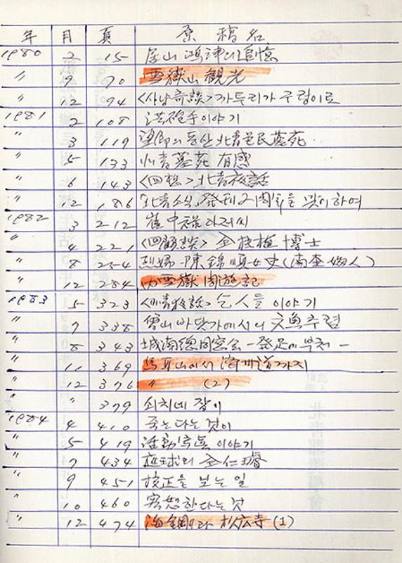 1955.8.17-1956.3.7 시사만화 <도토리 군>, <서울신문>연재, 160회 연재 1956.4.13-1956.8.24 명랑만화 <신판 봉이 김선달>, <서울신문>연재 1950년대 말부터 어린이만화책 <도토리>시리즈 발행 어린이신문 연재만화. <두더쥐 두루뭉> 광문당 등 출판사에서 연재 1978 <소년한국일보>연재